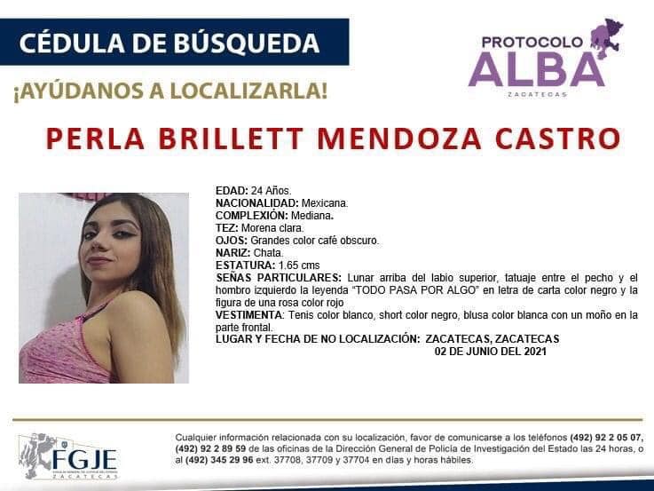 Esta jovencita, originaria de Fresnillo y estudiante de enfermería desapareció el 2 de junio de 2021, cuando, luego de asistir a un curso acudió a un bar en la capital zacatecana y desde donde envió un mensaje de voz a su mamá para avisarle que ya iba de salida a su casa, sólo estaban esperando a que bajara un poco la lluvia porque se irían caminando, fue la última comunicación de Perla Brillett con su familia.