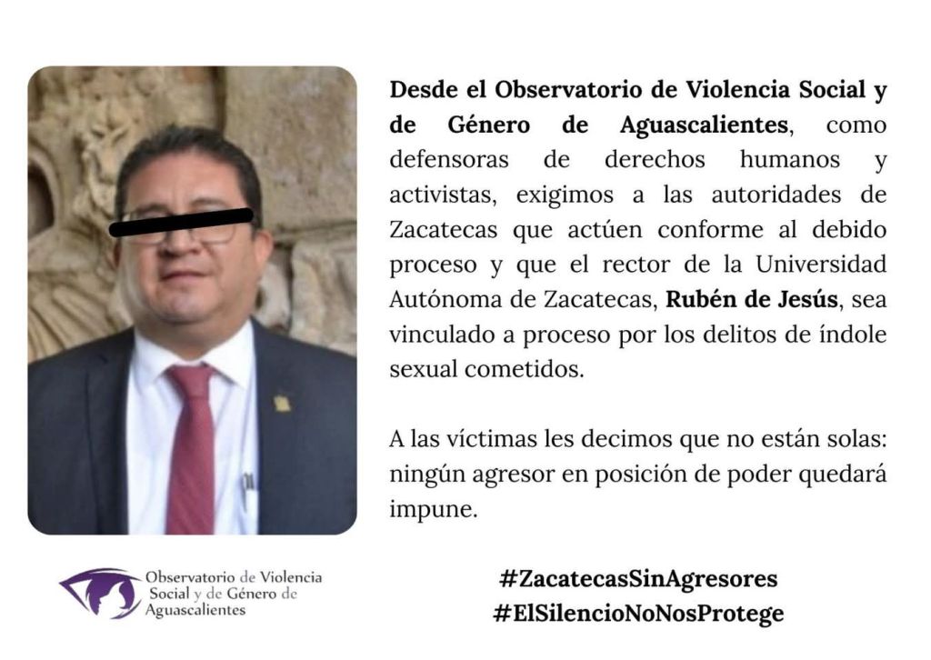 Desde el Observatorio de Violencia Social y de Género de Aguascalientes, como defensoras de derechos humanos y activistas, exigimos a las autoridades de Zacatecas que actúen conforme al debido proceso y que el rector de la Universidad Autónoma de Zacatecas, Rubén de Jesús, sea vinculado a proceso por los delitos de índole sexual cometidos.