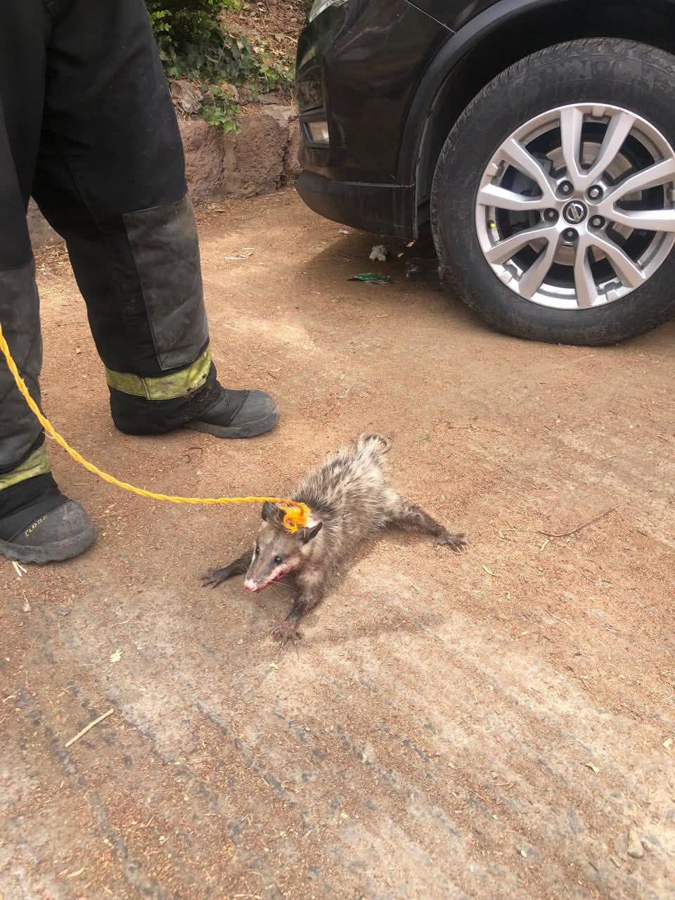 Al arribar al lugar, se localizó un tlacuache atrapado en la parte baja del motor de un vehículo, específicamente en la zona de la salpicadera. Durante la inspección, se detectó que el animal presentaba una lesión visible en la boca.