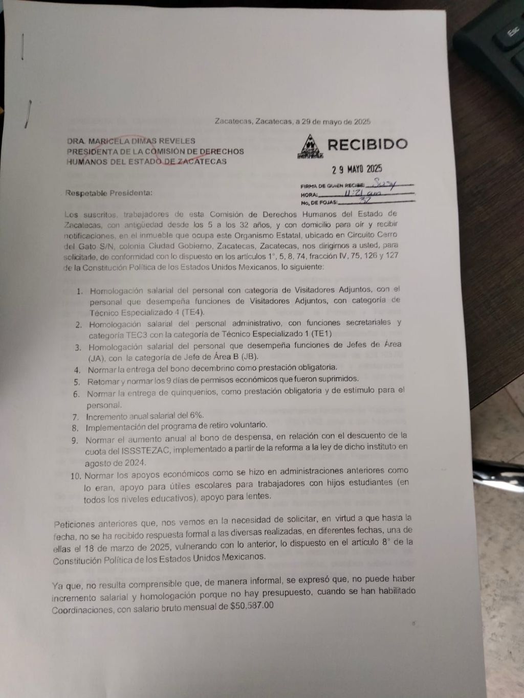 Adjunto al presente, compartimos el contenido íntegro del segundo escrito en que expresamos nuestras solicitudes de aumento salarial y de prestaciones laborales, que fuera recibido en la Oficialía de Partes de la Comisión de Derechos Humanos del Estado de Zacatecas, el pasado día 29 de mayo de 2025, así como una imagen de la caratula del escrito donde consta su acuse de recibido. E insistimos, solo pedimos consideración y atención a nuestras necesidades.