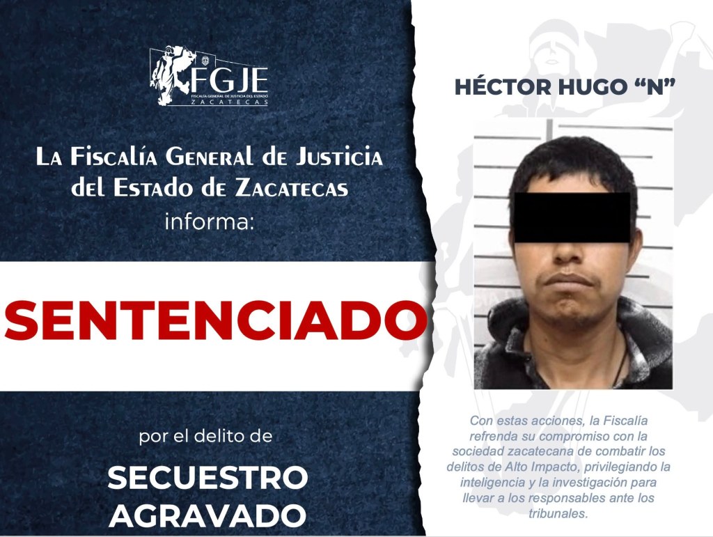 Los hechos ocurrieron en febrero de 2024, cuando Héctor Hugo «N», en compañía de otros sujetos, arribó hasta la ubicación de la víctima en Ojocaliente, Zacatecas, donde la privarían de la libertad de manera violenta y por quien exigieron una cuantiosa cantidad a los familiares cambio de su liberación, quien finalmente fue liberada con vida.