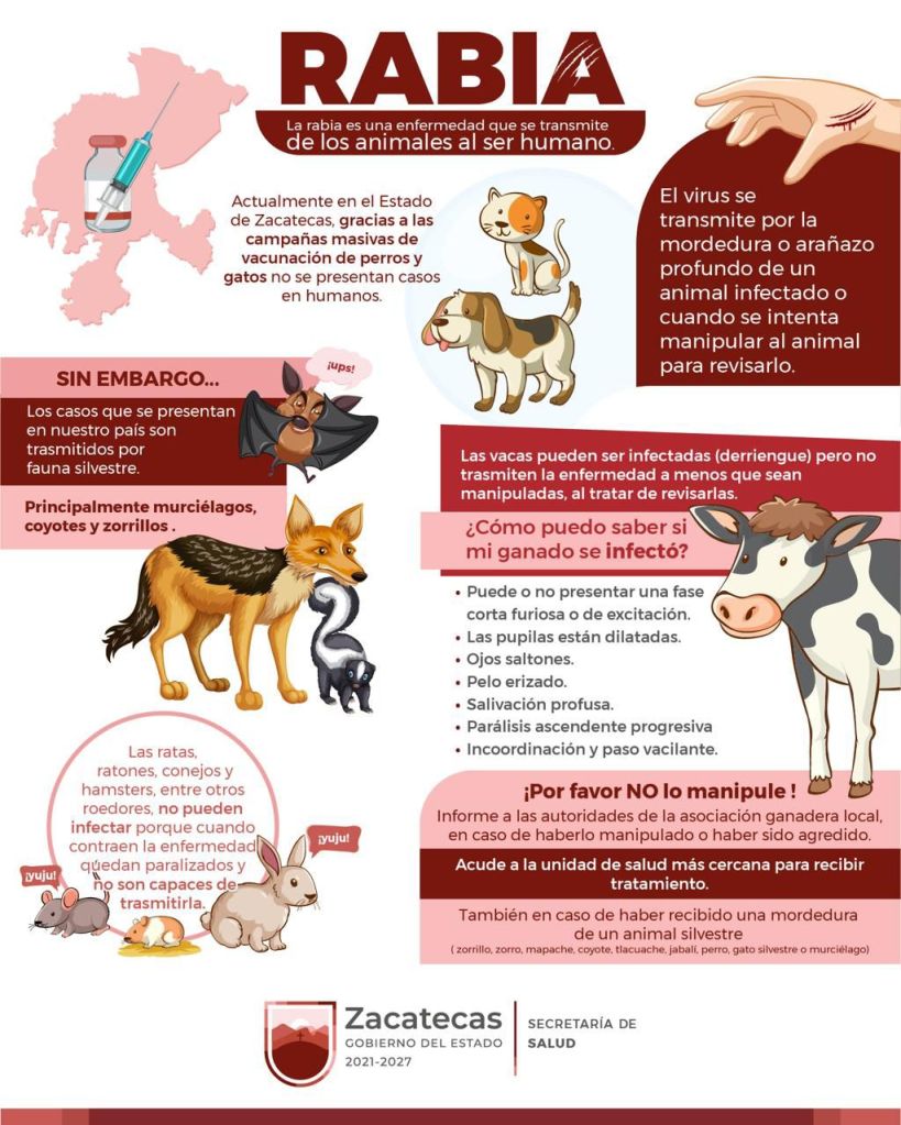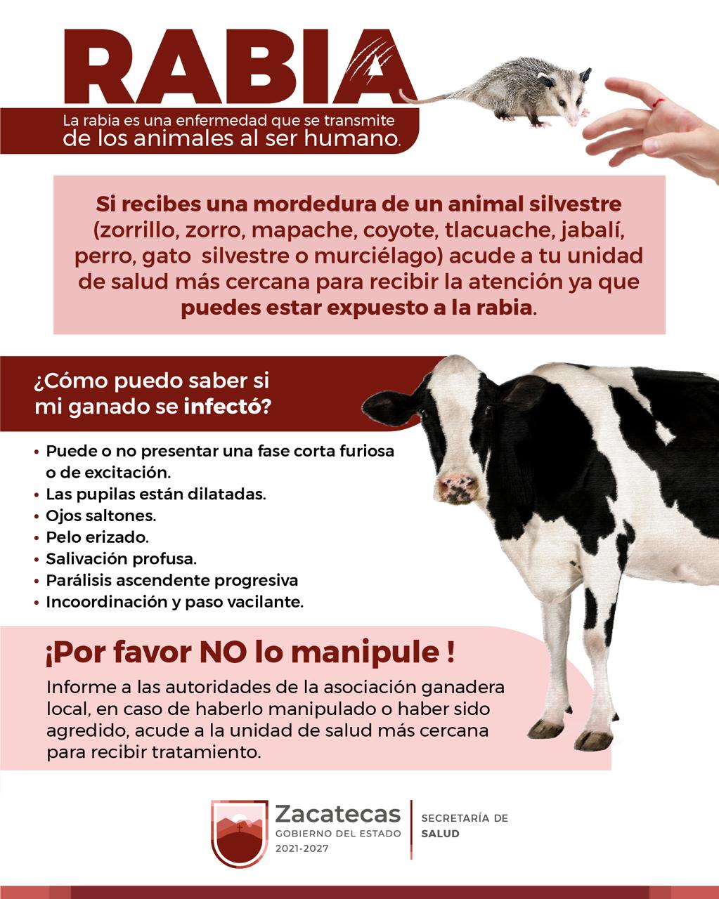 El Gobierno de Zacatecas hace un llamado a la población para que, en caso de mordedura de animales silvestres, acuda de inmediato a la unidad de salud más cercana