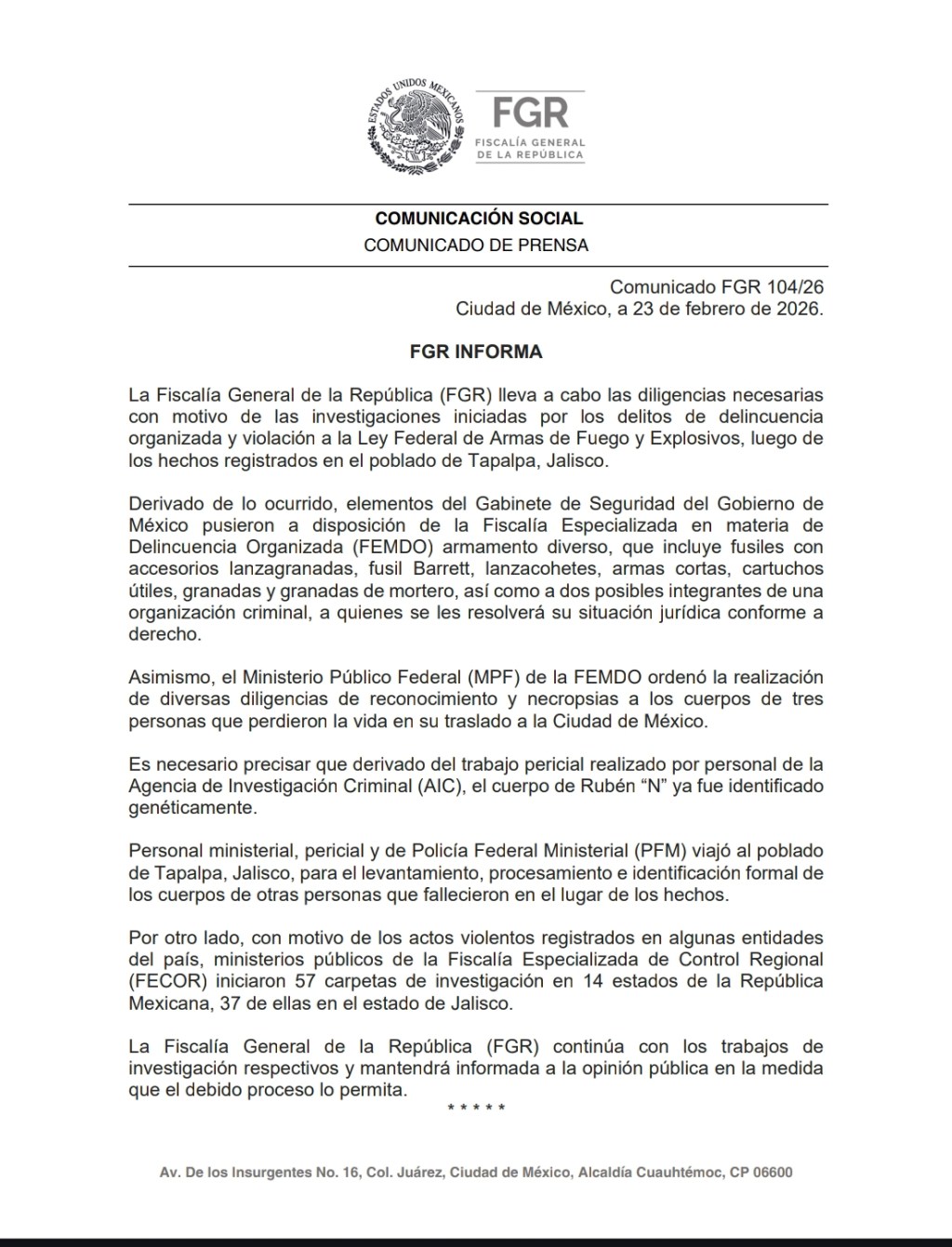La Fiscalía General de la República (FGR) lleva a cabo las diligencias necesarias con motivo de las investigaciones iniciadas por los delitos de delincuencia organizada y violación a la Ley Federal de Armas de Fuego y Explosivos, luego de los hechos registrados en el poblado de Tapalpa, Jalisco.