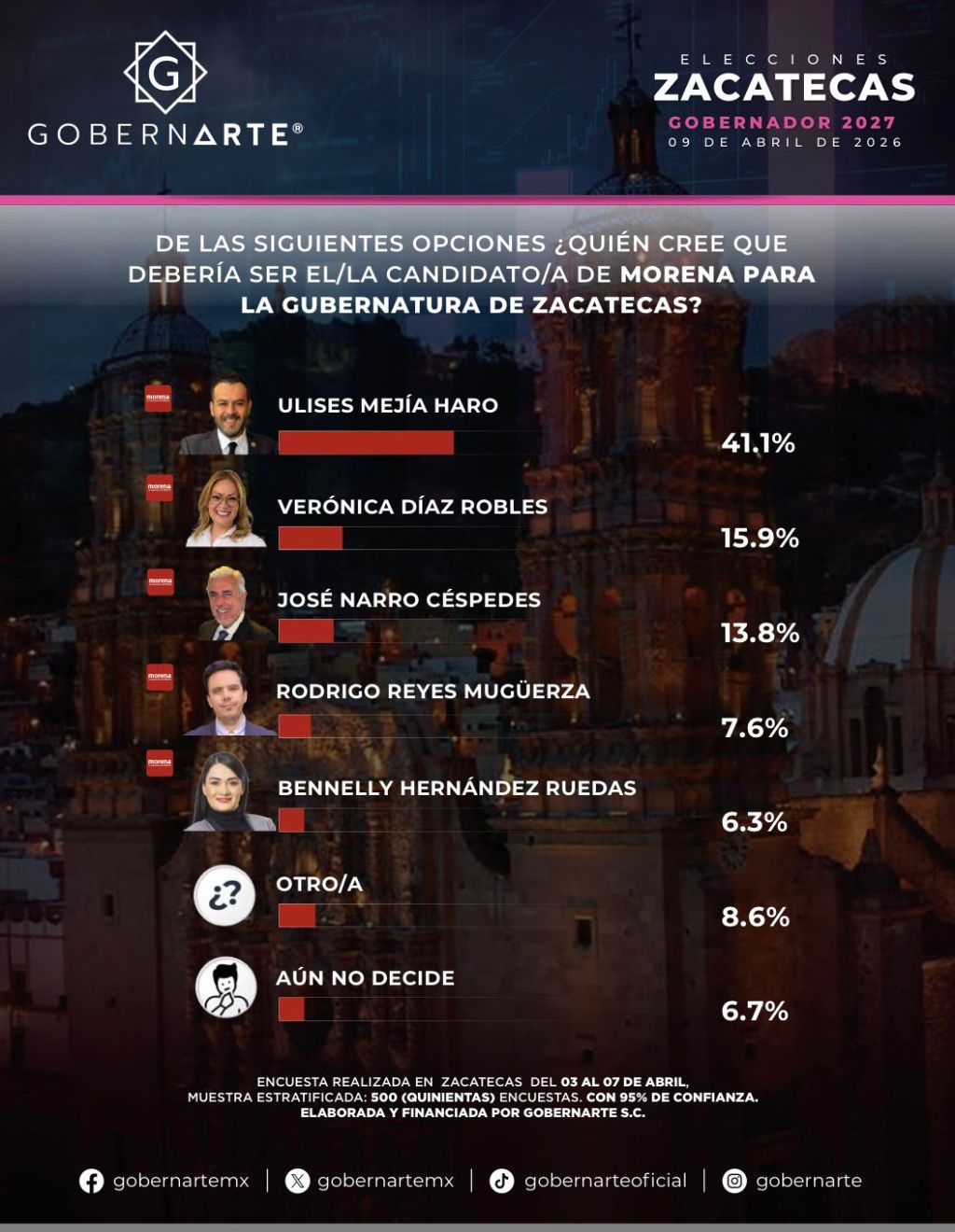 Zacatecas, Zac.– El diputado federal Ulises Mejía Haro continúa consolidándose como el perfil mejor posicionado dentro de Morena rumbo a la gubernatura de Zacatecas, de acuerdo con la más reciente encuesta nacional de GobernArte.